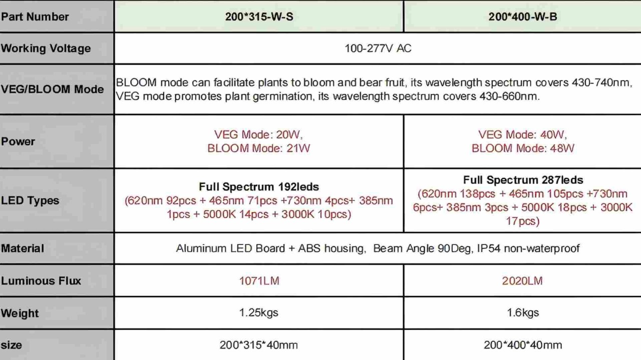 | Power | VEG Mode: 20W , BLOOM Mode: 21W | VEG Mode: 40W , BLOOM Mode: 48W | ||||