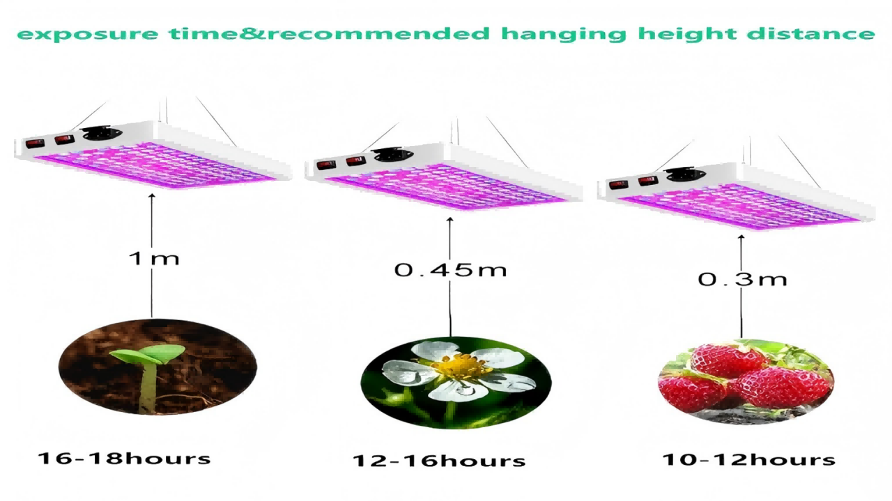 The equipped hanging kit makes this grow light easier to install, and the hanging height can be adjusted. According to the plant growth cycle, it is recommended to hang about 8-30 inches from the top of the plant.