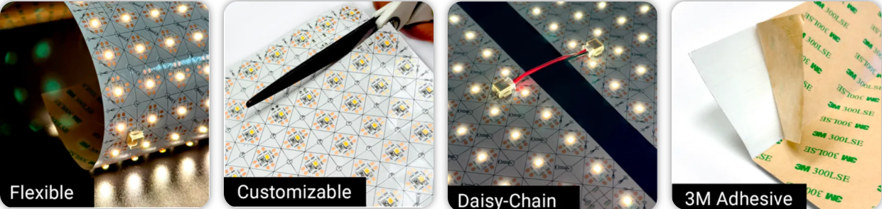 Mounted on a durable dual-layer flexible PCB, the panels can be trimmed along marked cut lines and shaped to fit curved or irregular surfaces. With strong double-sided adhesive backing, installation is quick and hassle-free.