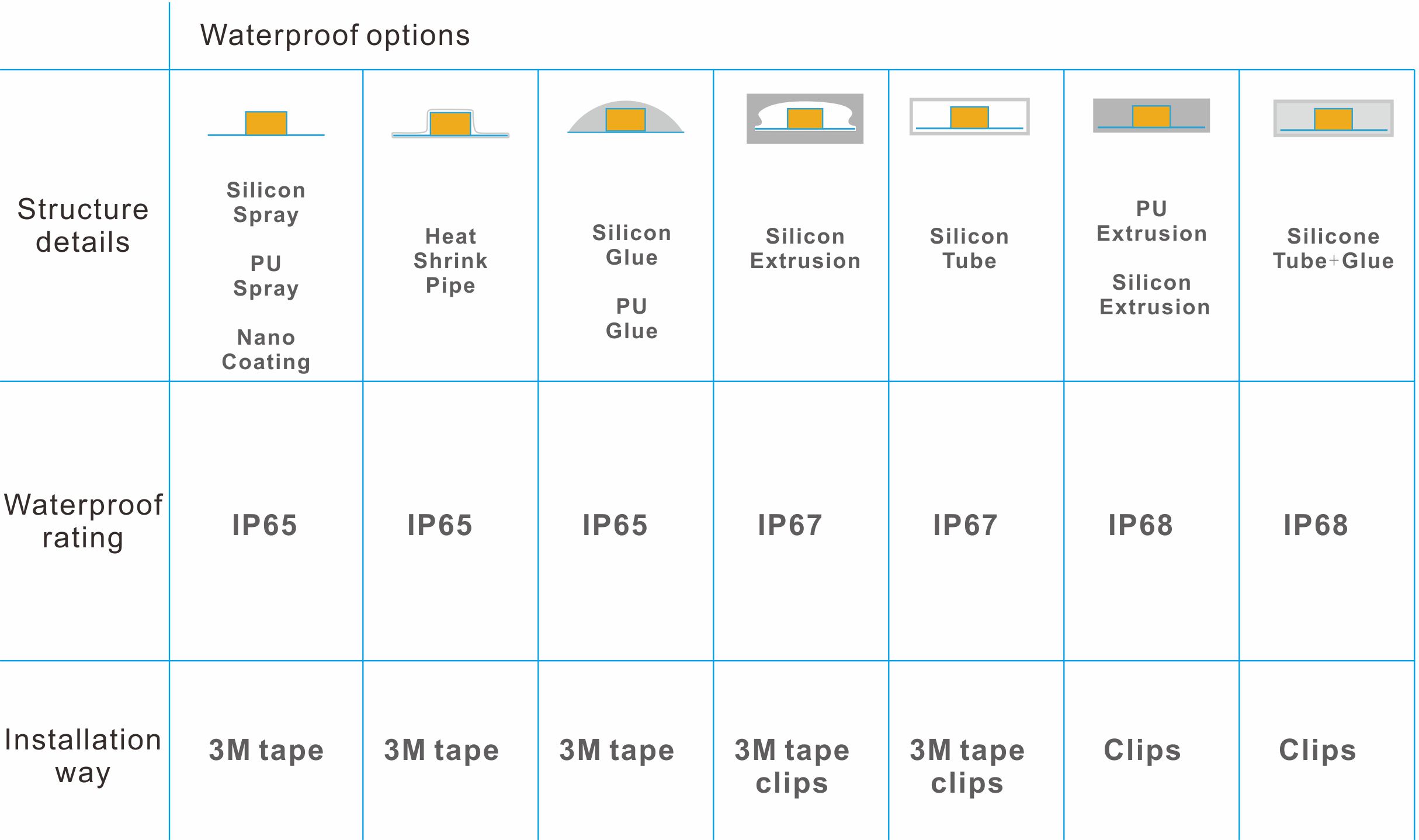 The differences between commonly sold IP65, IP67, & IP68 strips are slight, but very important. Using the above chart as a guide, we can see that all strips are protected at the highest level from solids and dust. The variations come with the protection against liquids.