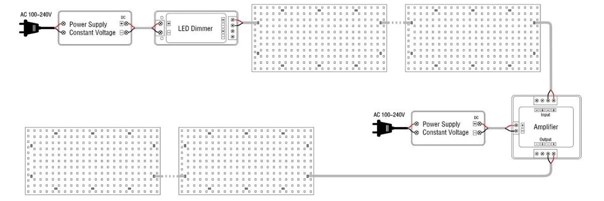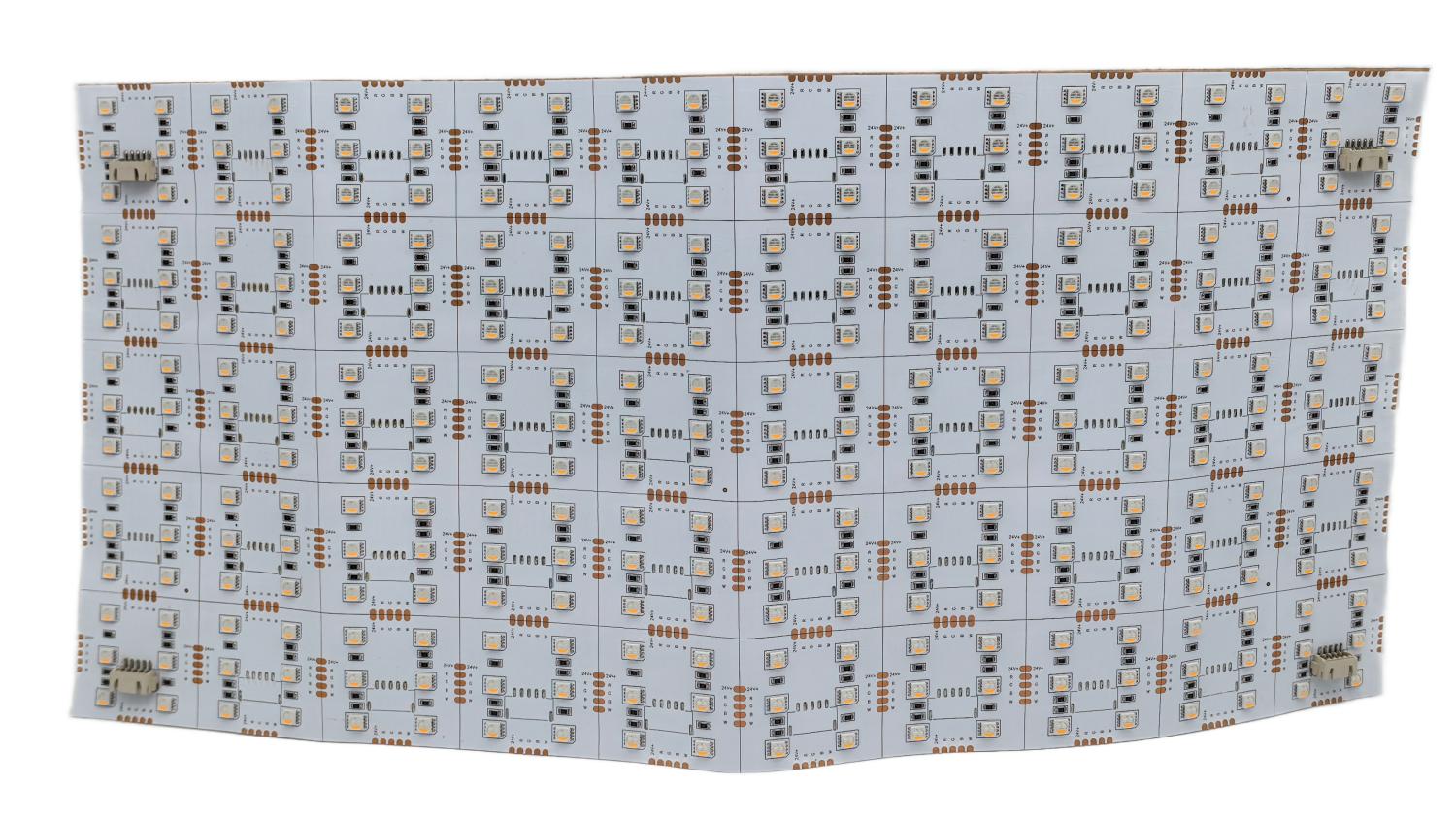 Designed with six connectors (input, output, and power), the panels allow easy linking for large programmable lighting setups. They can be trimmed along marked cut lines and shaped to fit curved or irregular surfaces.