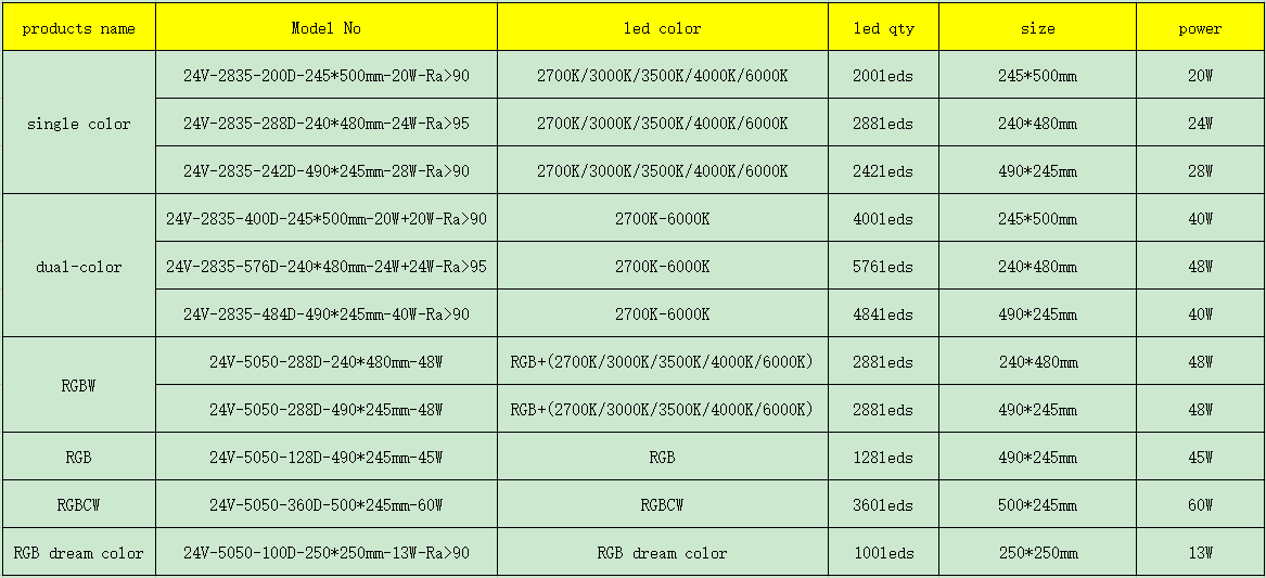Size( L x W ): 240*480/245*500mm/ 490mm*245mm LED type: 2835 SMD LED quantity: 288PCS/200PCS/ 242PCS Working voltage: DC24V Power: 24W/ 20W/28W CCT: 2700K/ 3000K/ 4000K/ 6000K/ 6500K Luminous flux: 1200lm/ 2800lm CRI: >90Ra/95Ra Dimmable: YES Beam angle: 120° Waterproof level: IP20 non-waterproof Warranty: 3 years
