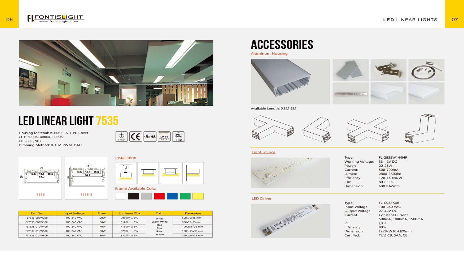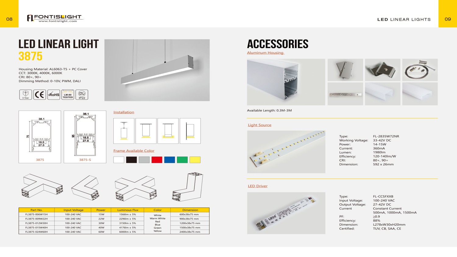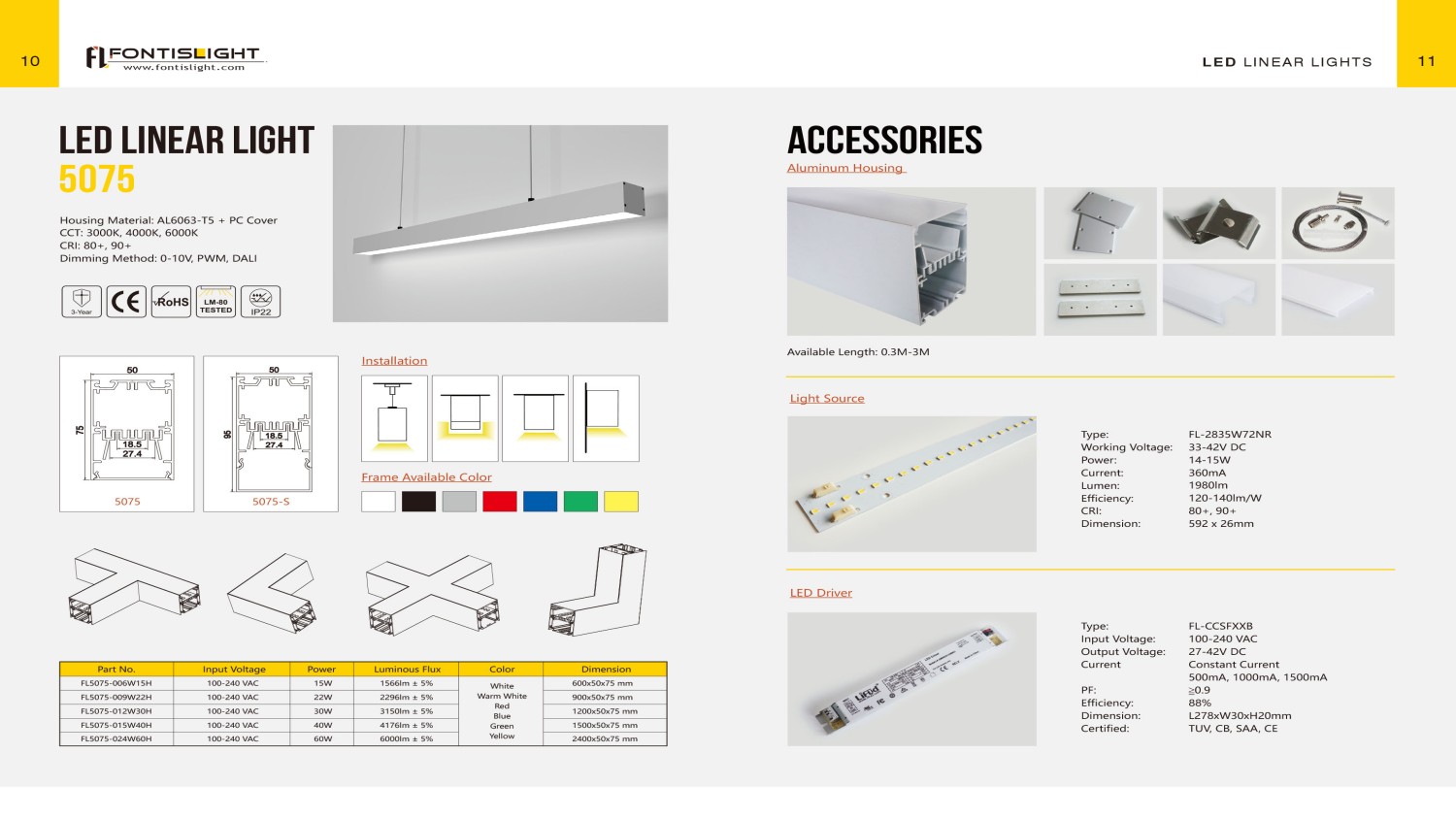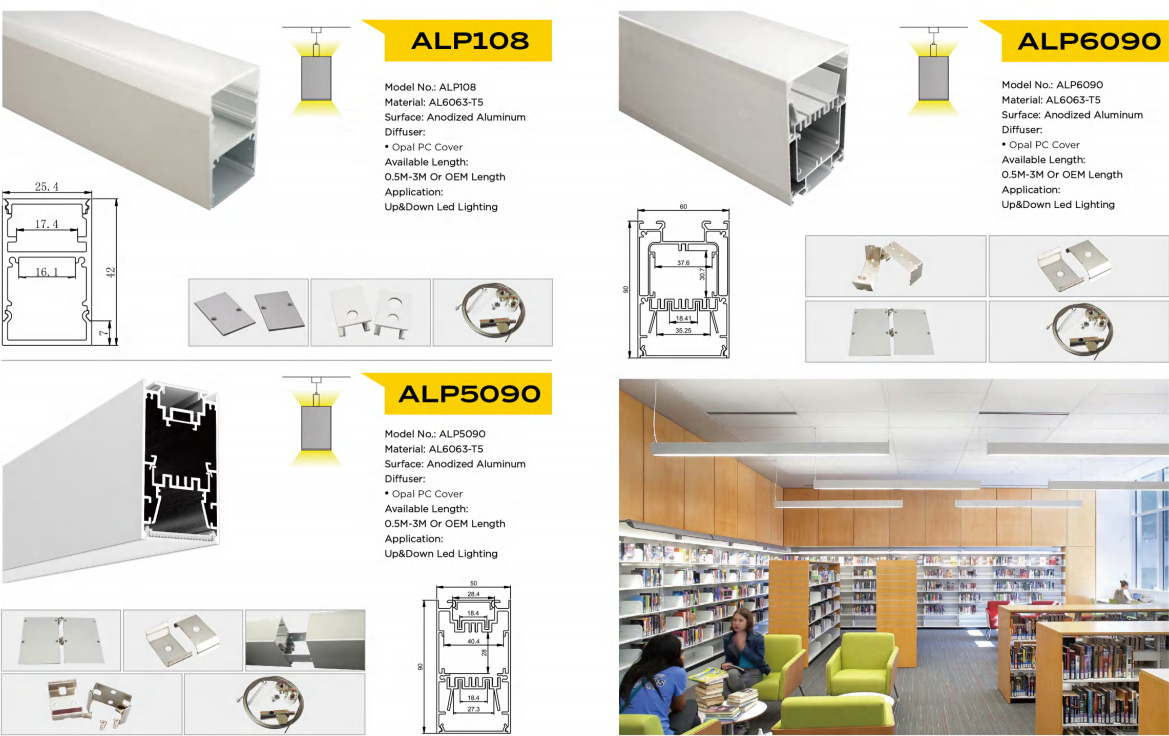 Material: 6063 Aluminium Profile + Opal Diffuser Length Option: 600mm/1200mm/1500mm/1800mm/2400mm LED Chip: SMD2835 Color Temperature: 3000K/4000K/6000K Luminous Flux: 100-110lm/W CRI: >80 PF: >0.9 Flicker Free: Yes Function Option: Non-dimming/0-10V dimming/Triac dimming/DALI dimming Finish Color Option: Black/White Installation Method: Suspended Mount/Ceiling Surface Mount/Wall Mount/Recessed Mount